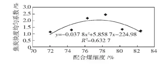 焦炭塊度均勻系數(shù)隨著配合煤細(xì)度的增加呈拋物線形式, 在約77%時(shí)達(dá)最大值。為了提高焦炭的大塊率, 因而配合煤細(xì)度也不易過(guò)高, 經(jīng)測(cè)算細(xì)度為76%時(shí), 焦炭大塊率較好。