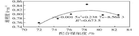 配合煤細(xì)度對(duì)配合煤堆密度、焦炭機(jī)械強(qiáng)度、熱強(qiáng)度及焦炭產(chǎn)量的影響, 用來(lái)指導(dǎo)實(shí)際生產(chǎn);在一定條件下, 按照實(shí)際使用的配比, 進(jìn)行不同細(xì)度下配合煤, 尋找配合煤細(xì)度與焦炭質(zhì)量、產(chǎn)量的對(duì)應(yīng)關(guān)系。